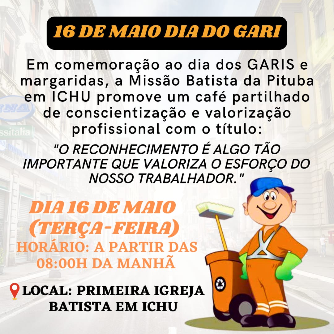 Em comemoração ao Dia do Garis e Margaridas, a Igreja Batista da Pituba em Ichu promove um Café Partilhado de conscientização e valorização profissional com o tema: O Reconhecimento é algo tão importante que valoriza o esforço do nosso trabalhador.