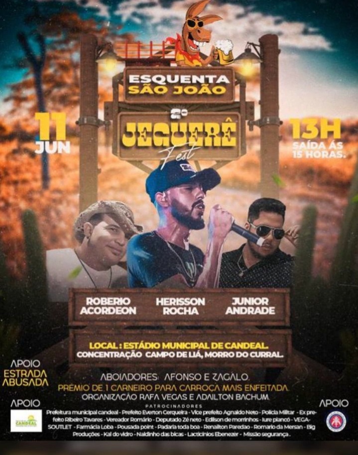 No próximo domingo, 11 de junho, a partir das 13 h, acontece no Estádio Municipal de Candeal, a 2ª Edição do Jeguerê organizado por Rafa Vegas e Batchu com Junior Andrade, Robério do Acordeon e Herisson Rocha.