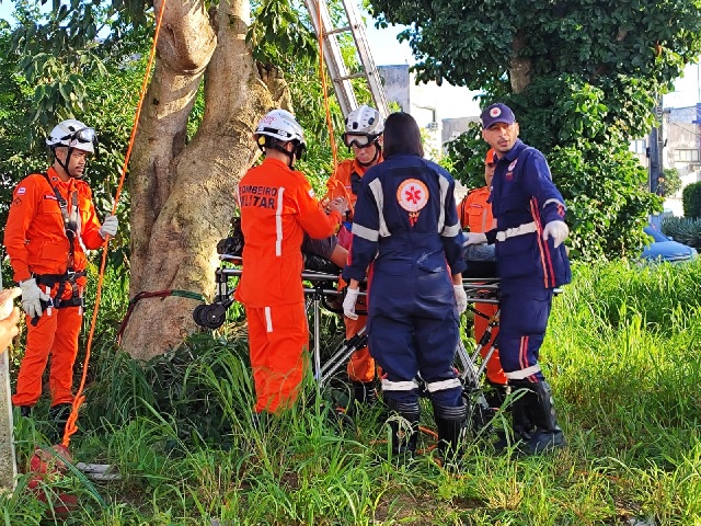Equipes da Polícia Militar, Serviço Móvel de Urgência (Samu) e Corpo de Bombeiros foram acionados para o resgate do jovem que tentou contra a própria vida ameaçando se jogar da árvore com fios amarrados ao pescoço.