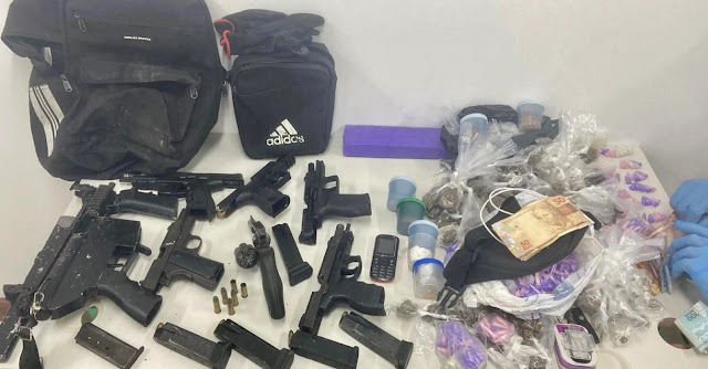 Com eles foram apreendidos uma submetralhadora e duas pistolas calibre 9mm, duas pistolas calibre 40, um revólver calibre 38, carregadores, munições, uma grande quantidade de drogas (maconha, cocaína e crack) e 761 reais.