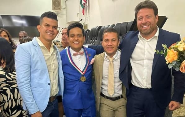 O cantor feirense Thiago Aquino recebeu na noite desta terça-feira (8) da Câmara Múnicipal de Feira de Santana a Comenda Maria Quitéria. A concessão da mais alta honraria do Legislativo feirense foi proposta pelo vereador e também artista musical Galeguinho SPA (PSB).
