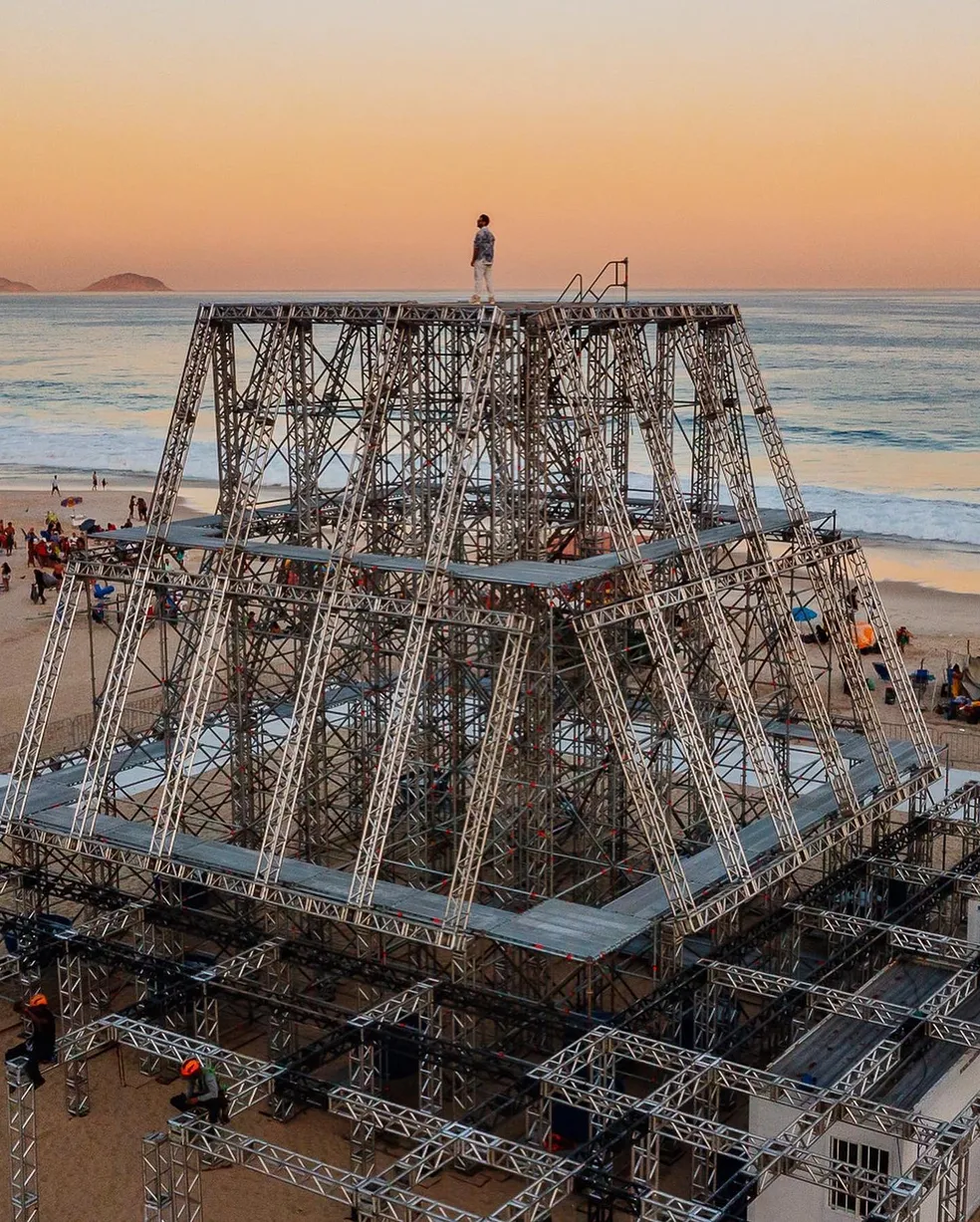 Alok no alto do palco que está sendo armado, em forma de pirâmide, em Copacabana — Foto: Alisson Demetrio/Divulgação