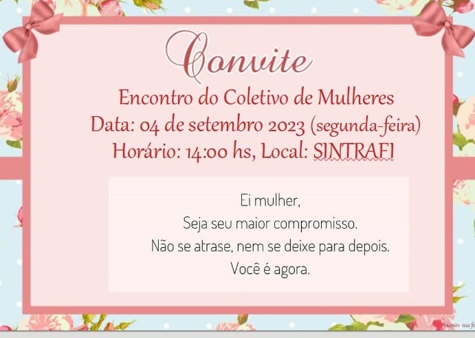 Na segunda-feira, 04 de setembro, às 14 h, acontece o Encontro do Coletivo de Mulheres do SINTRAFI – Sindicato dos Trabalhadores e Trabalhadoras na Agricultura Familiar de Ichu.