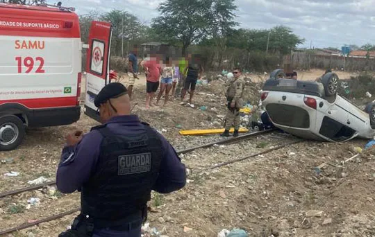 Carro capota sobre linha férrea em área urbana de Santaluz