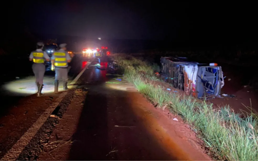 Ônibus de excursão religiosa capota em rodovia em Guatapará, SP, e deixa 8 mortos, além de feridos