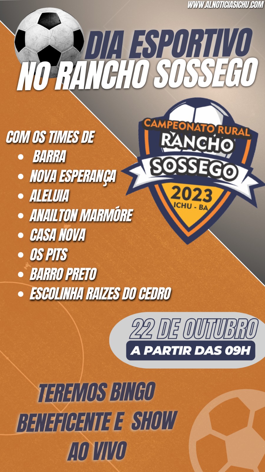 Visando ajudar as equipes que participarão do Campeonato Rural, a direção do Rancho Sossego está promovendo no próximo domingo, 22 de outubro, a partir das 9 h, um torneio em benefício as equipes que participarão do Campeonato Rural que inicia no dia 12 de novembro.