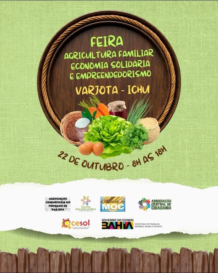 Com a organização e realização do CESOL – Centro Público de Economia Solidária e parceiros Associação Comunitária dos Amigos do Centro São João de Deus, COOPERAGIL, Associação Comunitária Local, Associação de Barra, Associação de Campinas, MOC- Movimento de Organização Comunitária, Associação Central de Cidadania, e Governo da Bahia por meio da Secretaria do Trabalho, Emprego, Renda e Esporte, acontece no domingo, 22, a Feira da Agricultura Familiar no povoado de Varjota em Ichu.