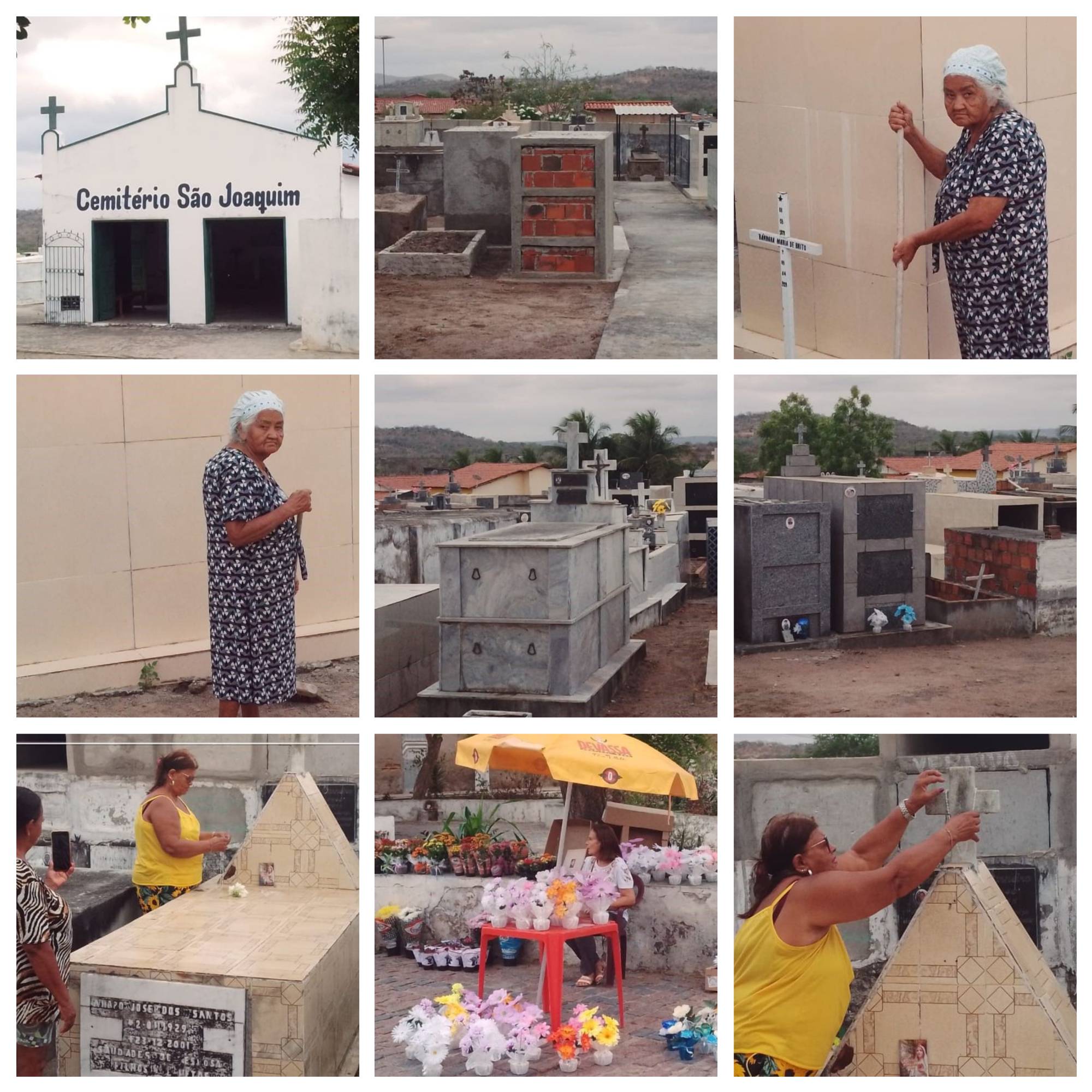Entrando no cemitério, encontramos a senhora Maria Brito, mais conhecida por dona Maria de Zé Torrote, que estava varrendo ao redor do jazigo em que está enterrada a sua mãe Bárbara Maria de Brito (Dona Santa) que faleceu em 2020 aos 97 anos.