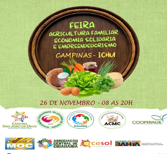 Ichu: Dia 26 de Novembro (Domingo), ocorrerá a Feira da Agricultura Familiar, Economia Solidária e Empreendedorismo na Comunidade de Campinas