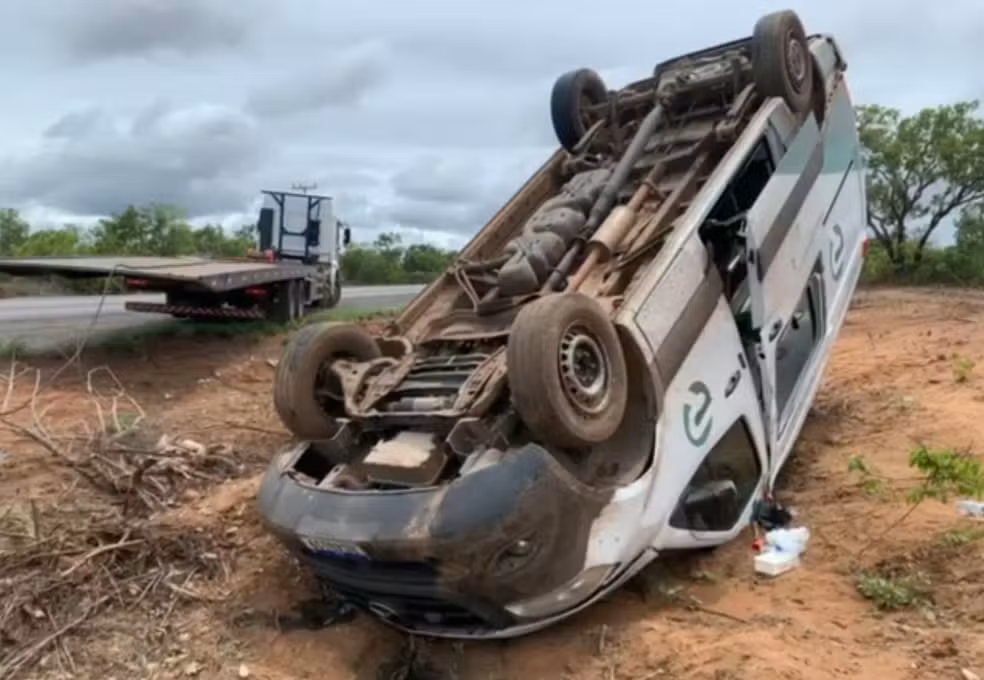 Ambulância com cinco pessoas capota e fica com rodas para cima no oeste da Bahia