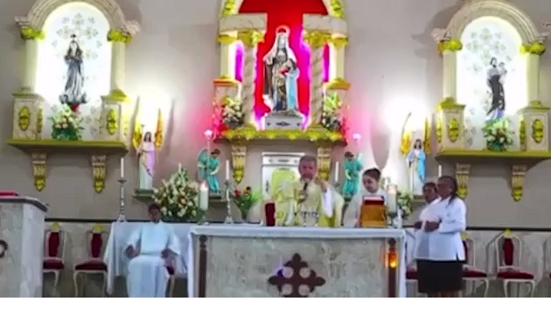 “Não vou dar a comunhão aqui na nave central porque esse tapete está fazendo vocês escorregarem, porque não é tapete, é um negócio muito devagar, que escorrega, né? Pra não dizer que é coisa ruim. Foi essa condição que os noivos tiveram, infelizmente. A gente percebe que eles são bem simples e que a arrumação é bem simples, né? Deve ser um casal pobre”, disse o padre.