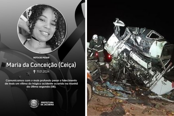 Morreu na madrugada desta quinta-feira (11) mais uma das vítimas do acidente entre um micro-ônibus e um caminhão truck, na noite de domingo (7). na BR-324. A prefeitura de Jacobina informou, em nota de pesar, que Maria da Conceição Fernandes não resistiu aos ferimentos e veio a óbito no Hospital Regional Vicentina Goulart (HRVG), onde estava internada. Ao todo, são 25 óbitos.