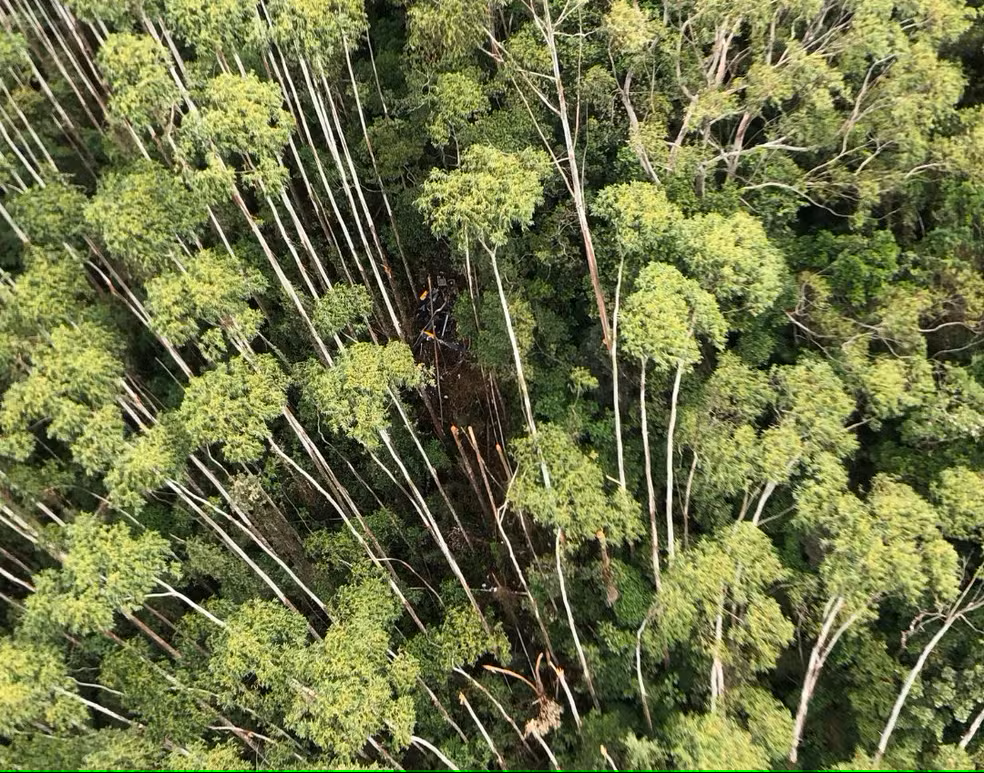 Na imagem divulgada pela Polícia Militar, é possível ver uma clareira entre a vegetação e o que seriam os destroços da aeronave entre as árvores (veja abaixo).