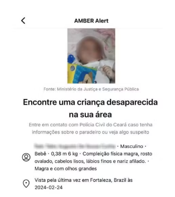 No caso do desaparecimento do bebê de dois meses em Fortaleza, a Polícia Civil do Ceará acionou o protocolo Amber Alerts junto ao Ciberlab, do Ministério da Justiça.