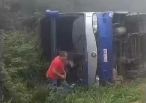 O motorista do veículo, para evitar uma batida frontal, teria realizado uma manobra brusca desviando da direção da carreta, mas o ônibus tombou.