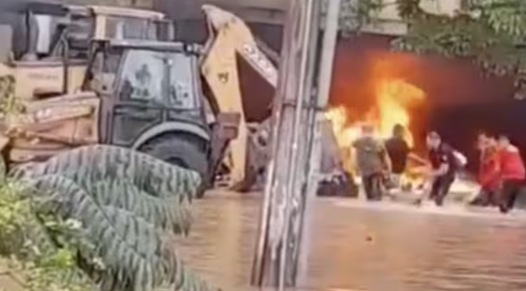O incidente ocorreu quando veículos que trabalhavam para resgatar vítimas do desastre climático reabasteciam no posto de gasolina inundado.