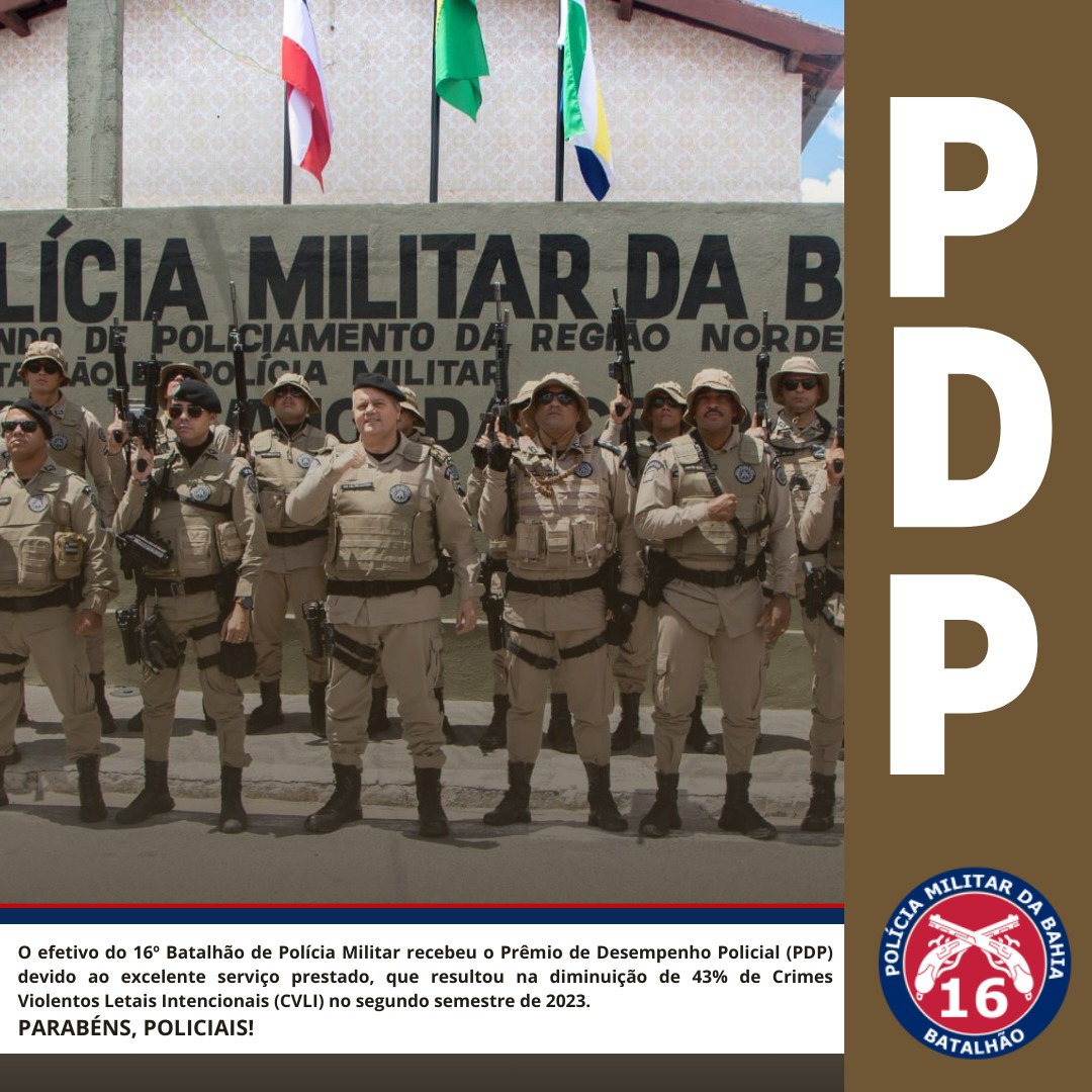 Nesta terça-feira (14), o efetivo do 16º Batalhão de Polícia Militar recebeu o Prêmio de Desempenho Policial (PDP) devido ao excelente serviço prestado, que resultou na diminuição de 43% de Crimes Violentos Letais Intencionais (CVLI) no segundo semestre de 2023. O prêmio é pago pelo Governo do Estado em reconhecimento pelo trabalho desses servidores.