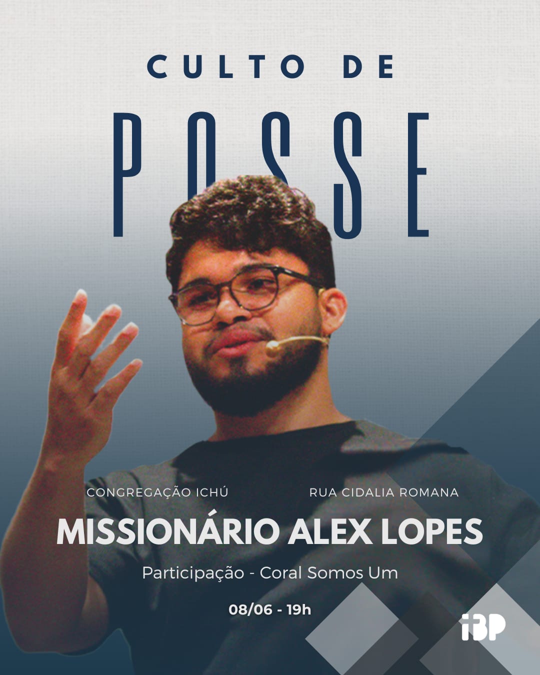 No próximo sábado, 8 de junho, às 19 h, será empossado na Igreja Batista de Ichu, o missionário Alex Lopes que é natural de Juazeiro do Norte / CE.