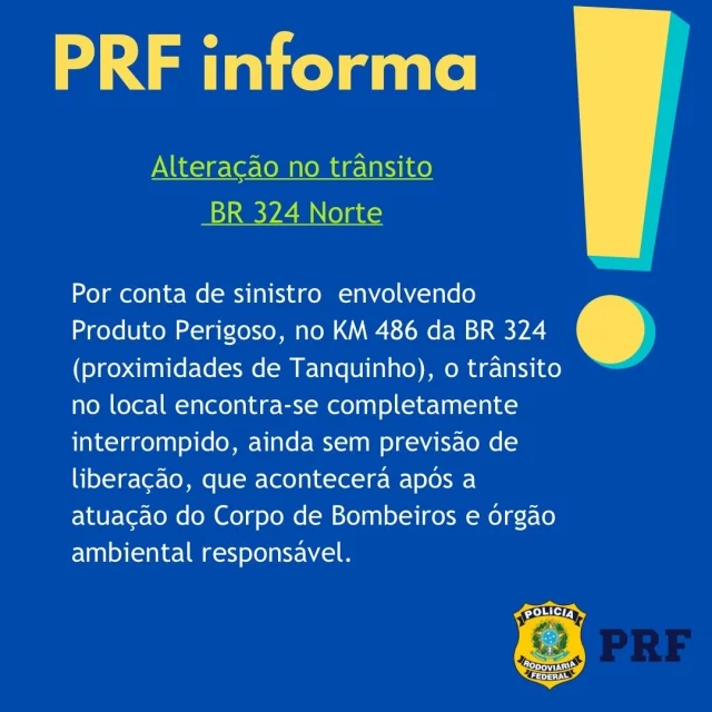 PRF comunica interrupção total de trecho da BR-324 após acidente