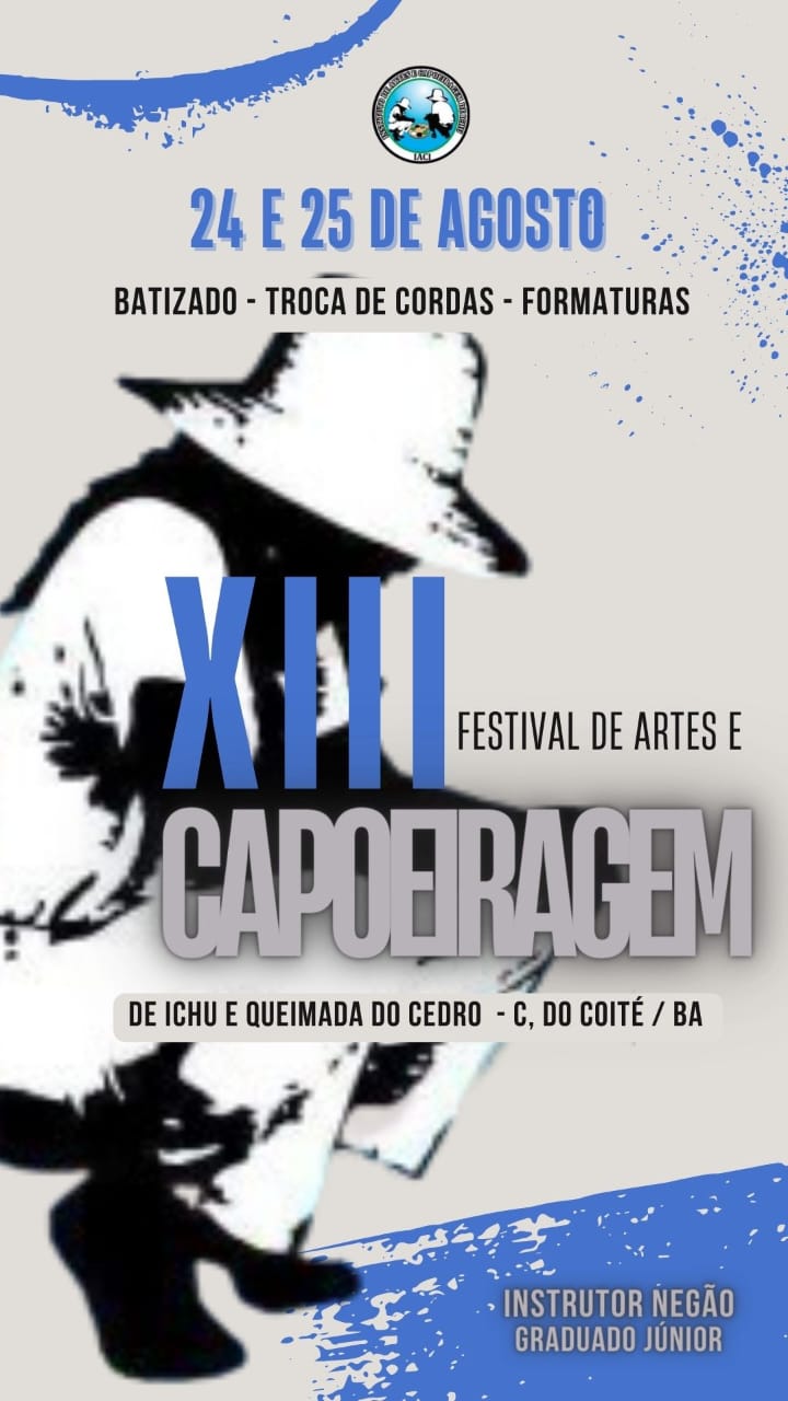 Com batizados, troca de cordas e formaturas, será realizado nos dias 24 e 25 de agosto a XIII Edição do Festival de Arte e Capoeiragem de Ichu e Queimada do Cedro (Coité) organizado pelo Instituto de Arte e Capoeiragem de Ichu – IACI.