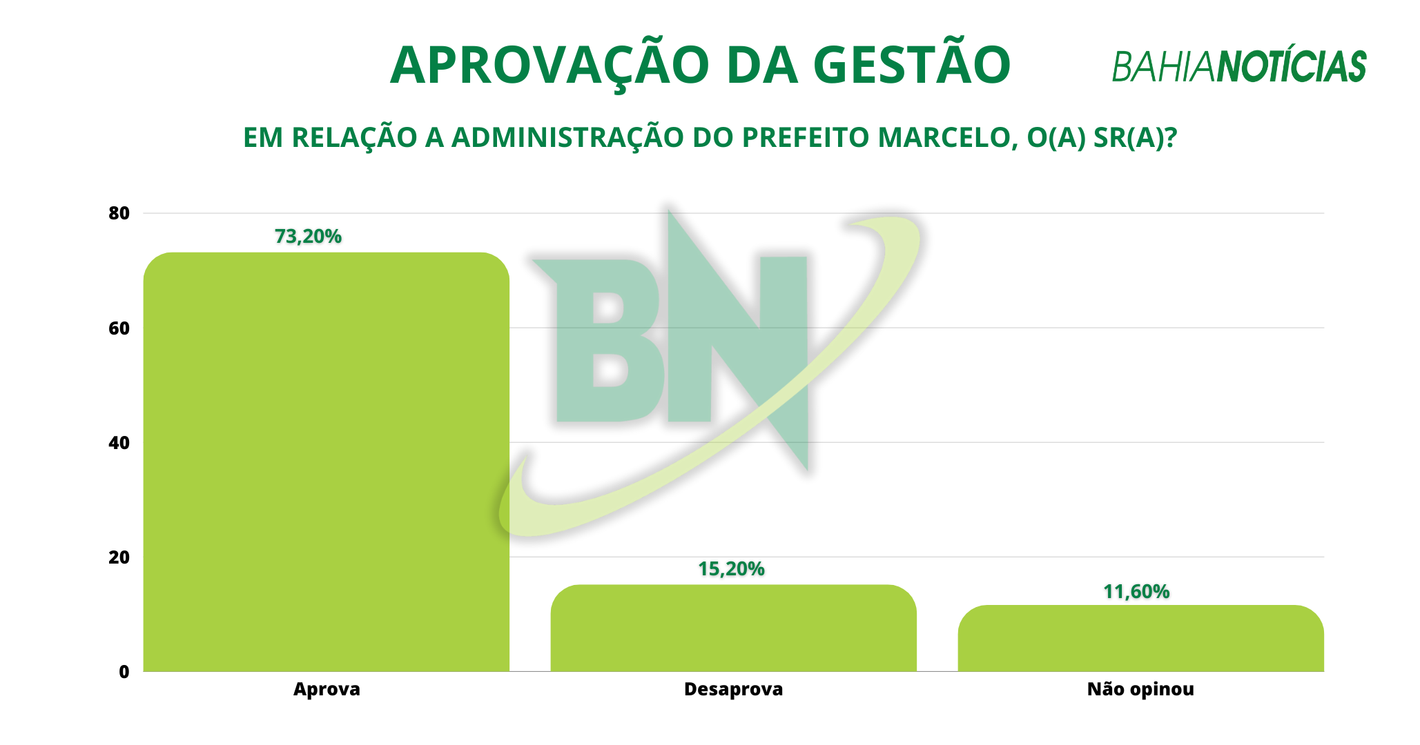 Com relação ao atual mandato do prefeito Marcelo, 15,20% dos entrevistados desaprovaram o mandato e outros 11,60% não sabem ou não opinaram. A pesquisa ouviu 1.500 eleitores entre os dias 20 a 22 de julho de 2024 e tem margem de erro de 2,5% para mais ou para menos e 95% de intervalo de confiança. O levantamento está registrado no Tribunal Superior Eleitoral (TSE) sob n.° BA-07347/2024.