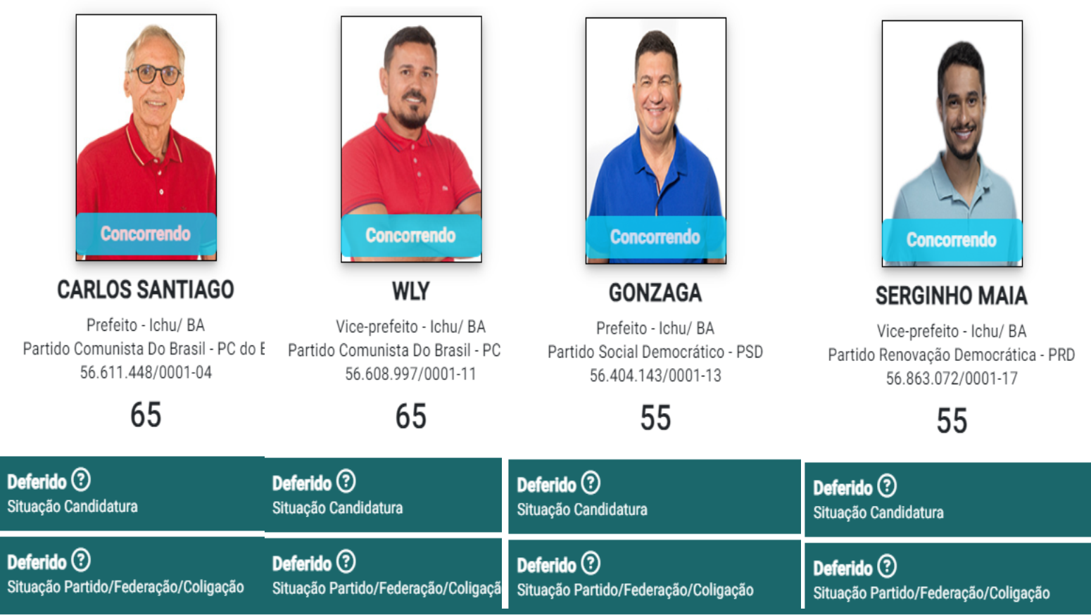 A Justiça Eleitoral da 132ª Zona Eleitoral de Conceição do Coité, responsável pelo município de Ichu, já havia DEFERIDO os pedidos de registros de candidaturas, inclusive com os pareceres do Ministério Público e de do Juiz Eleitoral, porém, na tela principal do sistema ainda encontrava-se como Aguardando Julgamento.