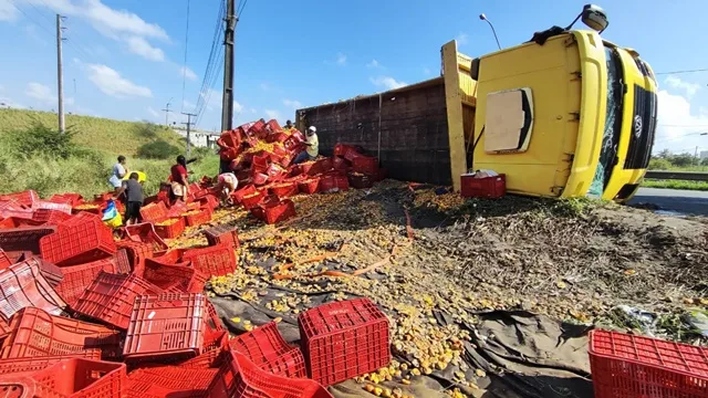 Um caminhão carregado com caju, tombou às margens da BR-324 em Feira de Santana, na manhã desta quinta-feira (5), próximo do viaduto da Avenida Noide Cerqueira.