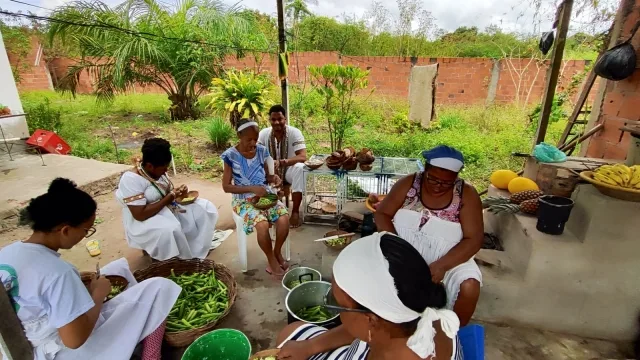 “A gente vem sempre um dia antes, os filhos se reúnem, trazem o material, começamos a limpar o camarão, o amendoim, tudo o que precisa ser feito. Hoje pela manhã, começamos o corte do quiabo para tudo estar pronto quando as crianças chegarem no final da tarde”.