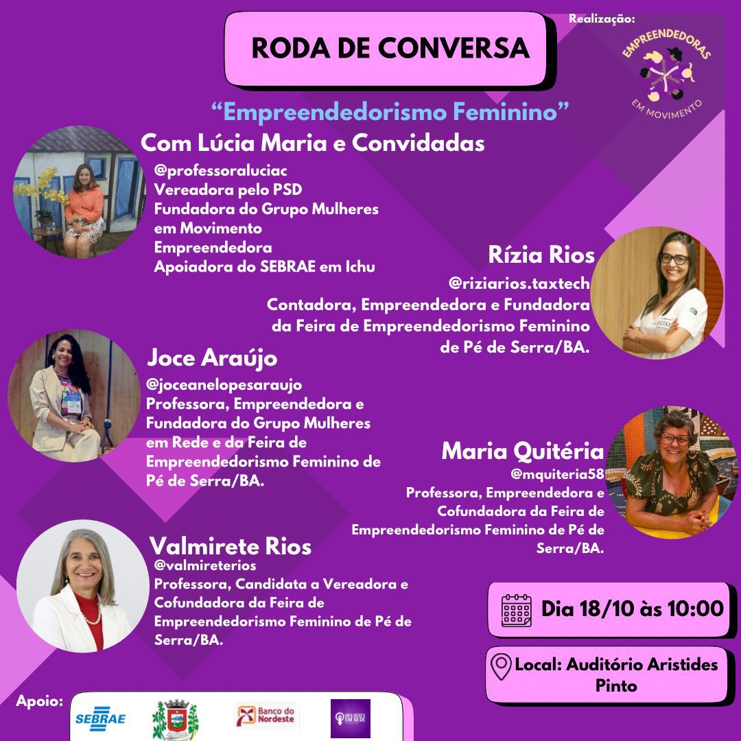 A Roda de Conversa será com a Professora Lúcia Maria (convidadas) que é vereadora do PSD, fundadora do Grupo Mulheres em Movimento, Empreendedora e Apoiadora do SEBRAE em Ichu. Terá ainda Rízia Rios (Contadora, Empreendedora e Fundadora da Feira de Empreendedorismo Feminino em Pé de Serra – BA.