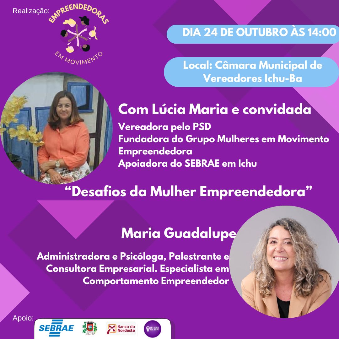 Esse novo momento terá a participação da Professora Lúcia Maria que é vereadora do PSD, fundadora do Grupo Mulheres em Movimento, Empreendedora e Apoiadora do SEBRAE em Ichu e convidada.