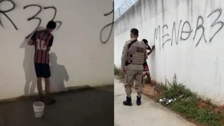 Jovens são obrigados a limpar muro após pichação em Serrinha