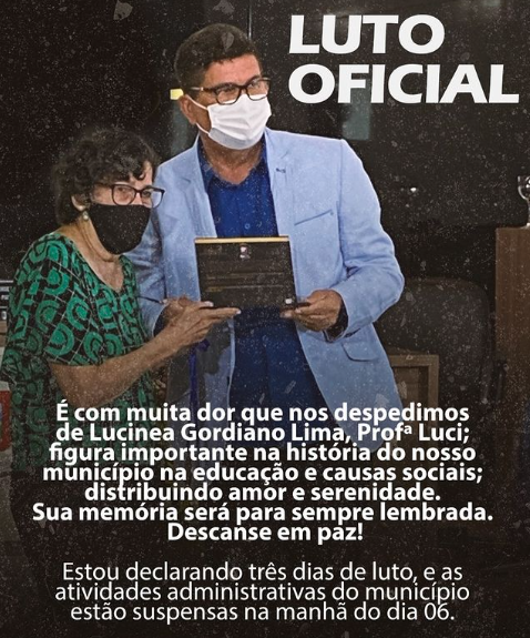 Foi publicado no Diário Oficial e nas redes sociais do Prefeito José Gonzaga, o Decreto de Luto Oficial de três dias no município de Ichu pelo falecimento da professora Lucinea Gordiano Lima, mais conhecido por Professora Luci, 82 anos, ocorrido nesta terça-feira, 05 de novembro de 2024.