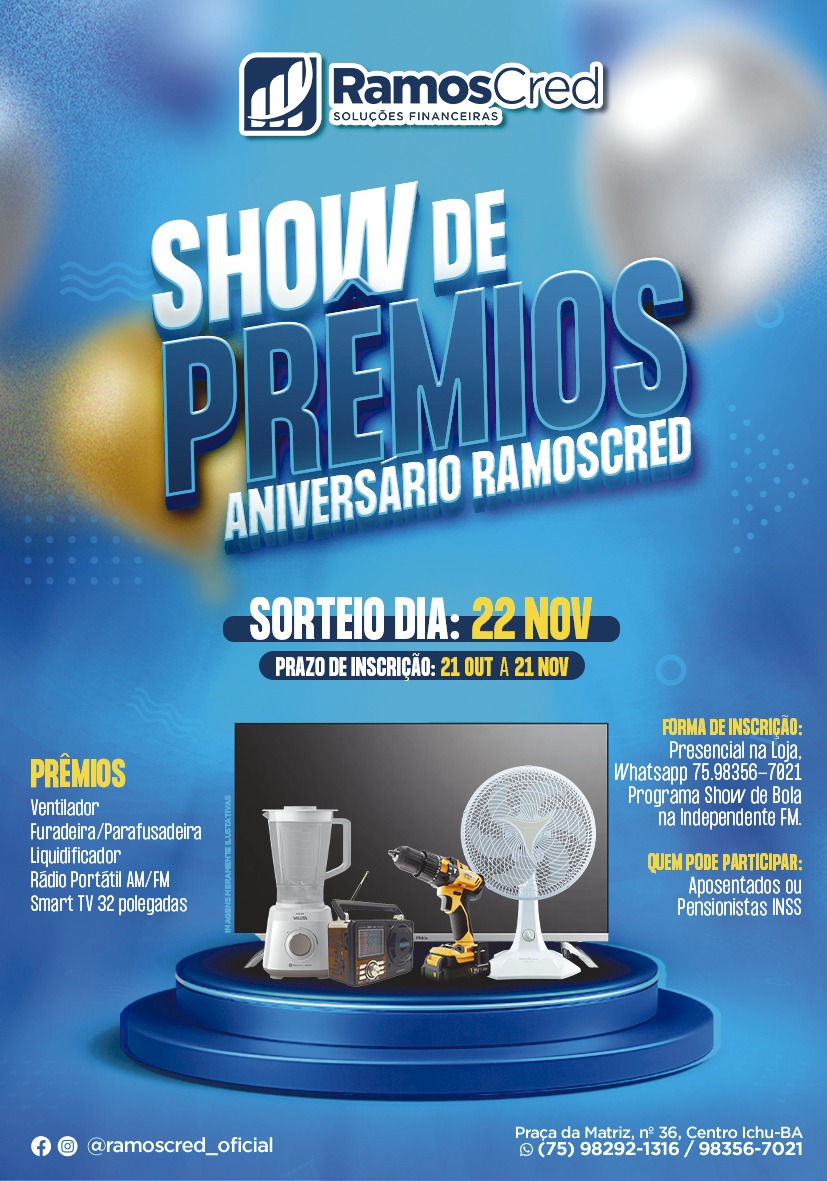Para Concorrer, faça sua inscrição até 21 de novembro, presencialmente na Loja Ramos Cred, localizada na Praça da Matriz, ao lado da Lotérica em Ichu, ou através do Fone / Zap: (75) 98356-7021.