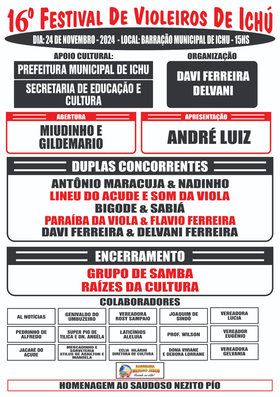 A apresentação será do Repórter André Luiz do site AL NOTÍCIAS com a abertura sendo feita pela dupla Miudinho e Gildemário. O encerramento será com o Grupo de Samba Raízes da Cultura. Haverá homenagem ao saudoso Nezito Pio.