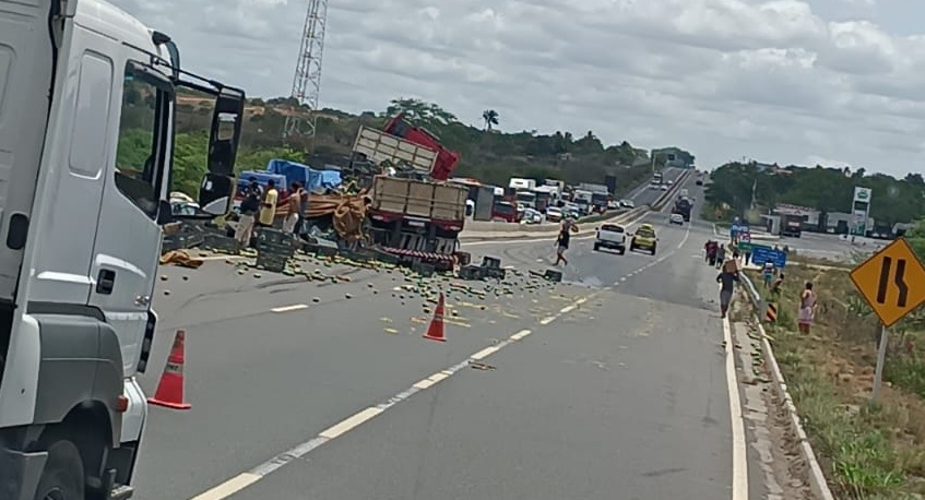 Mais um acidente envolvendo caminhão é registrado nas proximidades do Posto Trevo, quando no início da tarde desta terça-feira, 03, quando o motorista transportava uma carga com frutas perdeu o controle e foi ao encontro do canteiro central que divide as duas pistas da Rodovia BR 116 Norte, em frente ao acesso para o Posto Trevo, sentido Feira de Santana. Felizmente ninguém ficou ferido.