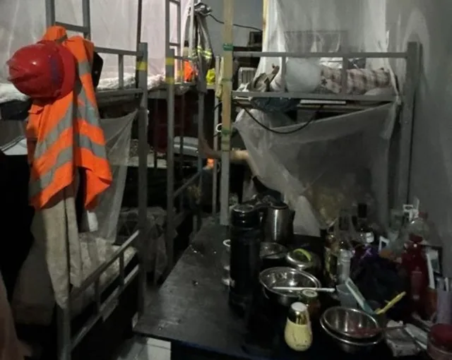 A situação em algumas das áreas de alimentação era igualmente precária. As cozinhas funcionavam em condições alarmantes, sem armários adequados para armazenamento de alimentos. Em um caso particularmente grave, foram encontrados materiais de construção civil próximos aos alimentos, e alimentos armazenados próximos a banheiros em condições insalubres. Apenas um dos alojamentos possuía um refeitório improvisado, com bancos e mesas de madeira em área semicoberta, ainda assim insuficiente para todos os trabalhadores, forçando a maioria a realizar suas refeições nas próprias camas.