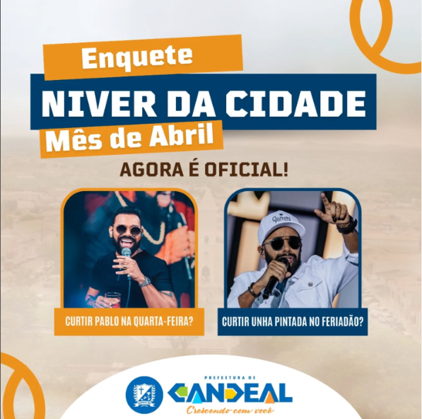 As eleições municipais ainda estão fresquinhas, afinal, aconteceram há apenas 4 meses, porém, os candealenses foram convidados a votar mais uma vez, só que agora não é para escolher prefeito, vice-prefeito e vereadores, mas sim para escolherem pelo Instagram se desejam curtir Unha Pintada no dia 20 ou Pablo no dia 23 abril quando o município completa 63 anos de Emancipação Política.