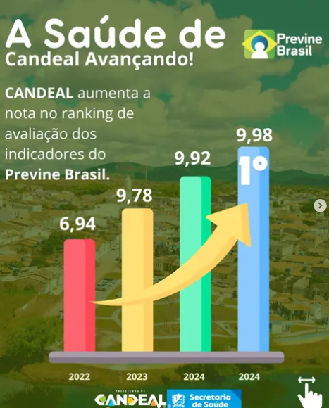 O município de Candeal, região sisaleira da bahia, ficou em primeiro lugar no ranking regional de Feira de Santana no Previne Brasil, cuja proposta tem como princípio a estruturação de um modelo de financiamento focado em aumentar o acesso das pessoas aos serviços da Atenção Primária e o vínculo entre população e equipe, com base em mecanismos que induzem à responsabilização dos gestores e dos profissionais pelas pessoas que assistem.