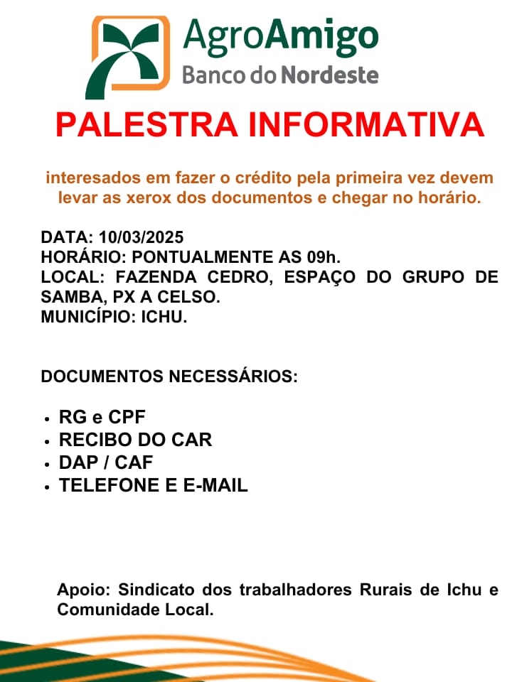 Ichu: Participe da Palestra Informativa do AgroAmigo do Banco do Nordeste