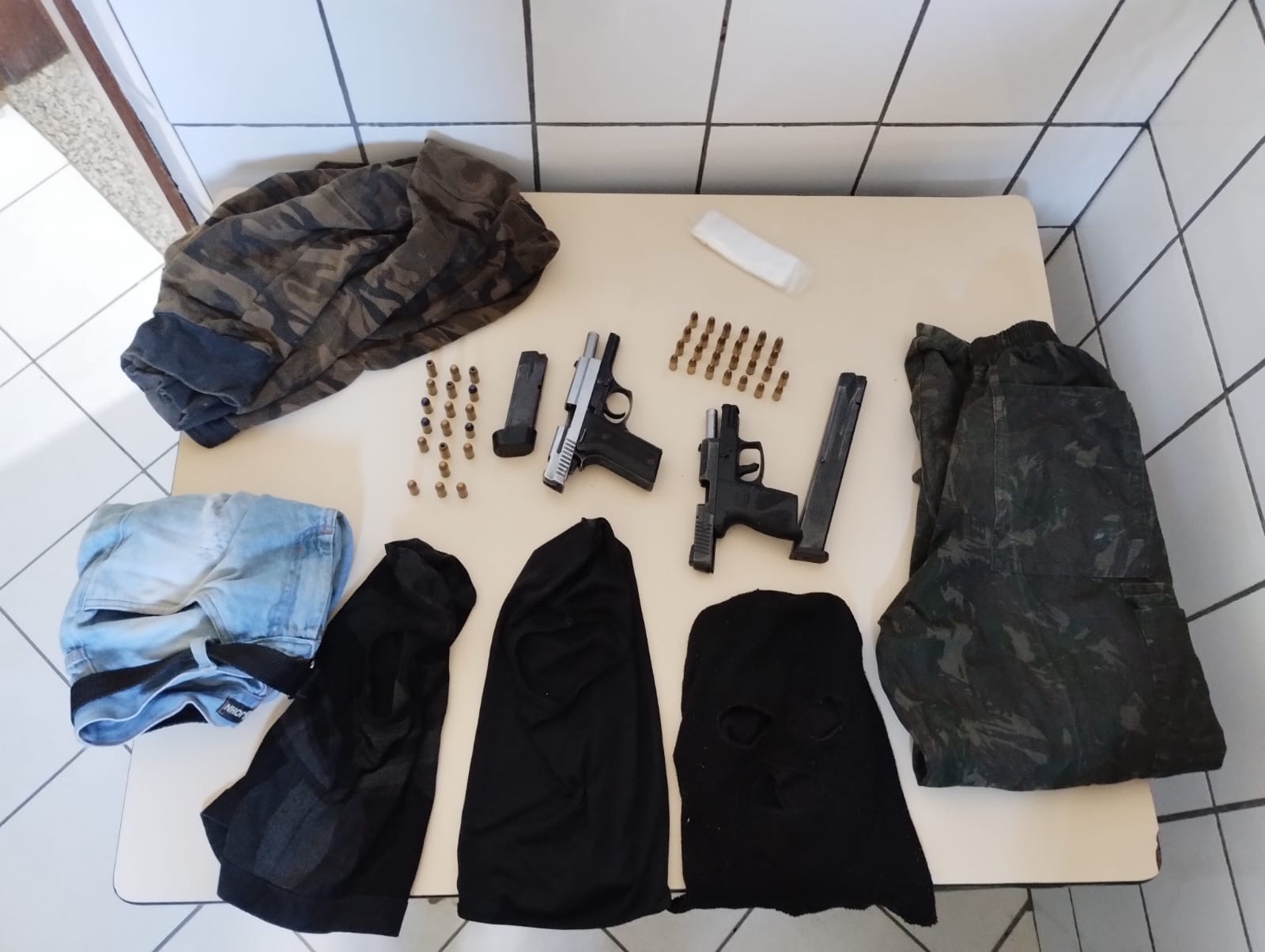Na tarde desta sexta-feira (31), por volta das 12h30, a Polícia Militar flagrou dois homens armados circulando a pé. Ao perceberem a presença das guarnições, os suspeitos tentaram fugir, pulando muros e invadindo residências.