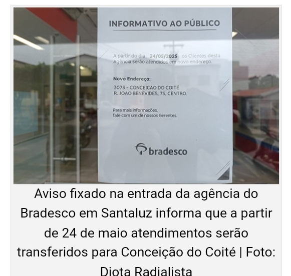 Quem mora em Santaluz e é cliente do Bradesco vai precisar se preparar pra uma mudança nada prática. A partir do dia 24 de maio, a unidade vai fechar as portas, e os atendimentos vão passar a ser feitos em Conceição do Coité — que fica a quase 50 quilômetros de distância.