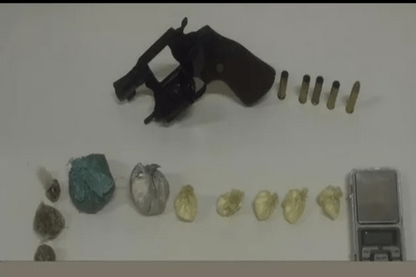 01 revólver Cal.38 N° ES 56486,04 munições deflagrada cal.38, 01 munição intacta Cal.38,05 porções de cocaína,04 porções de maconha,01 porção de crack,01 balança digital