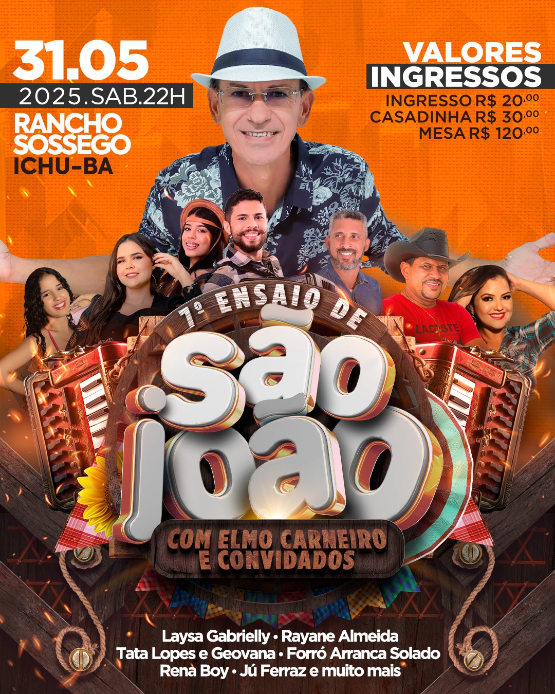 O forrozeiro ichuense Elmo Carneiro está à frente da organização da 7ª edição do Ensaio de São João, evento que acontecerá no próximo 31 de maio, no Rancho Sossego, em Ichu. A festa já se tornou uma tradição no município, marcando simbolicamente a abertura dos festejos juninos na cidade.