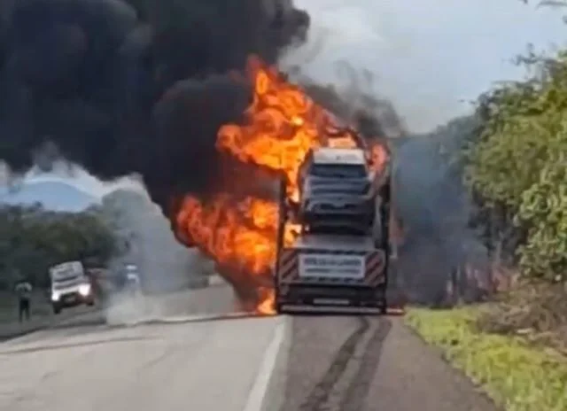 Na tarde deste domingo (25), um caminhão-cegonha carregado com veículos pegou fogo enquanto trafegava pela BR-407, no trecho que passa pelo município de Ponto Novo, no interior da Bahia.