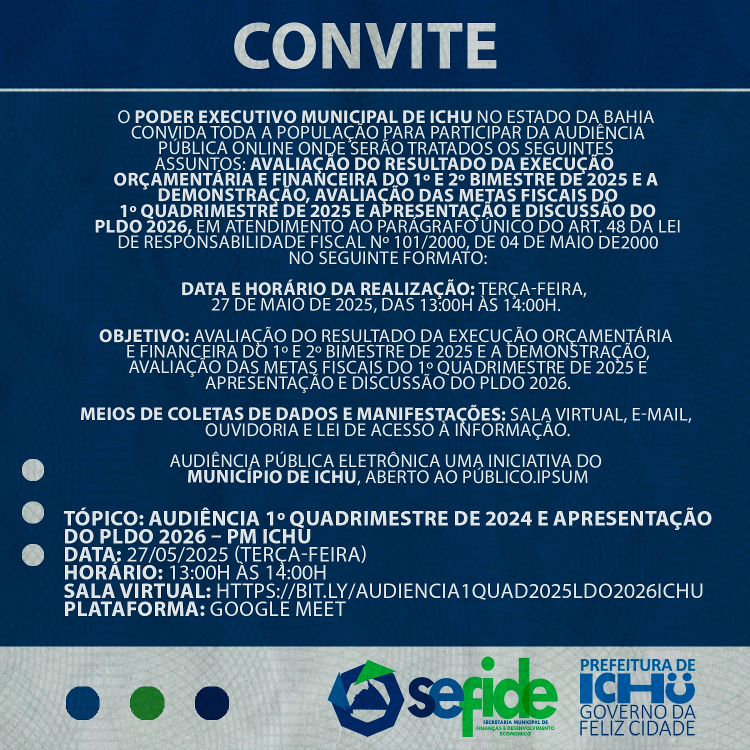 A Prefeitura Municipal de Ichu divulgou Edital Convite para Audiência Virtual que fará Avaliação do resultado da execução orçamentária e financeira do 1º e 2º bimestre de 2025 e a demonstração, avaliação das metas fiscais do 1º quadrimestre de 2025 e apresentação e discussão do PLDO 2026.
