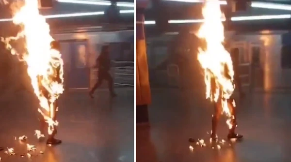Passageiros registraram o momento em que o homem atenta contra a própria vida. Um dos vídeos mostra que a vítima permanece o tempo todo em pé, mesmo depois de as chamas serem extintas pelos agentes de segurança do metrô.