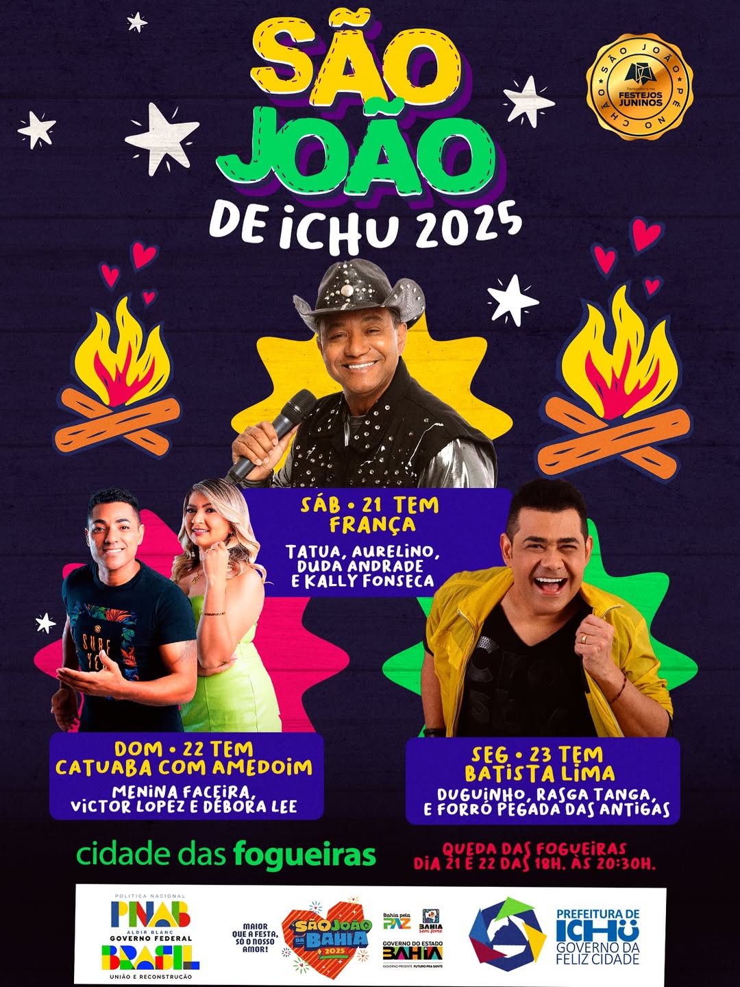 Com o tema “Cidade das Fogueiras”, inicia neste sábado, 21 de junho, os festejos de São João na Praça da Antiga Esplanada em Ichu. O evento promovido pela Prefeitura Municipal com o apoio do Governo Federal através da Lei Aldir Blanc e do Governo do Estado por meio da SUFOTUR prossegue até segunda-feira, 23.