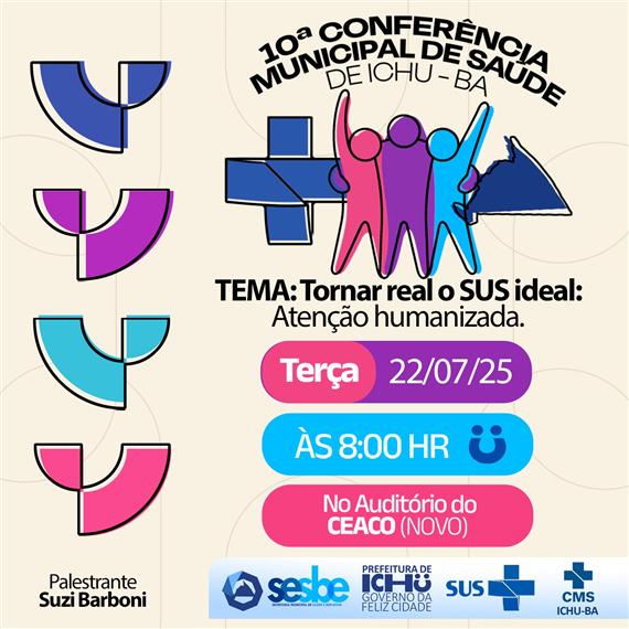 A Prefeitura de Ichu, por meio da Secretaria Municipal de Saúde (SESBE) e do Conselho Municipal de Saúde (CMS), realizará no próximo dia 22 de julho de 2025 (terça-feira) a 10ª Conferência Municipal de Saúde, com o tema central: