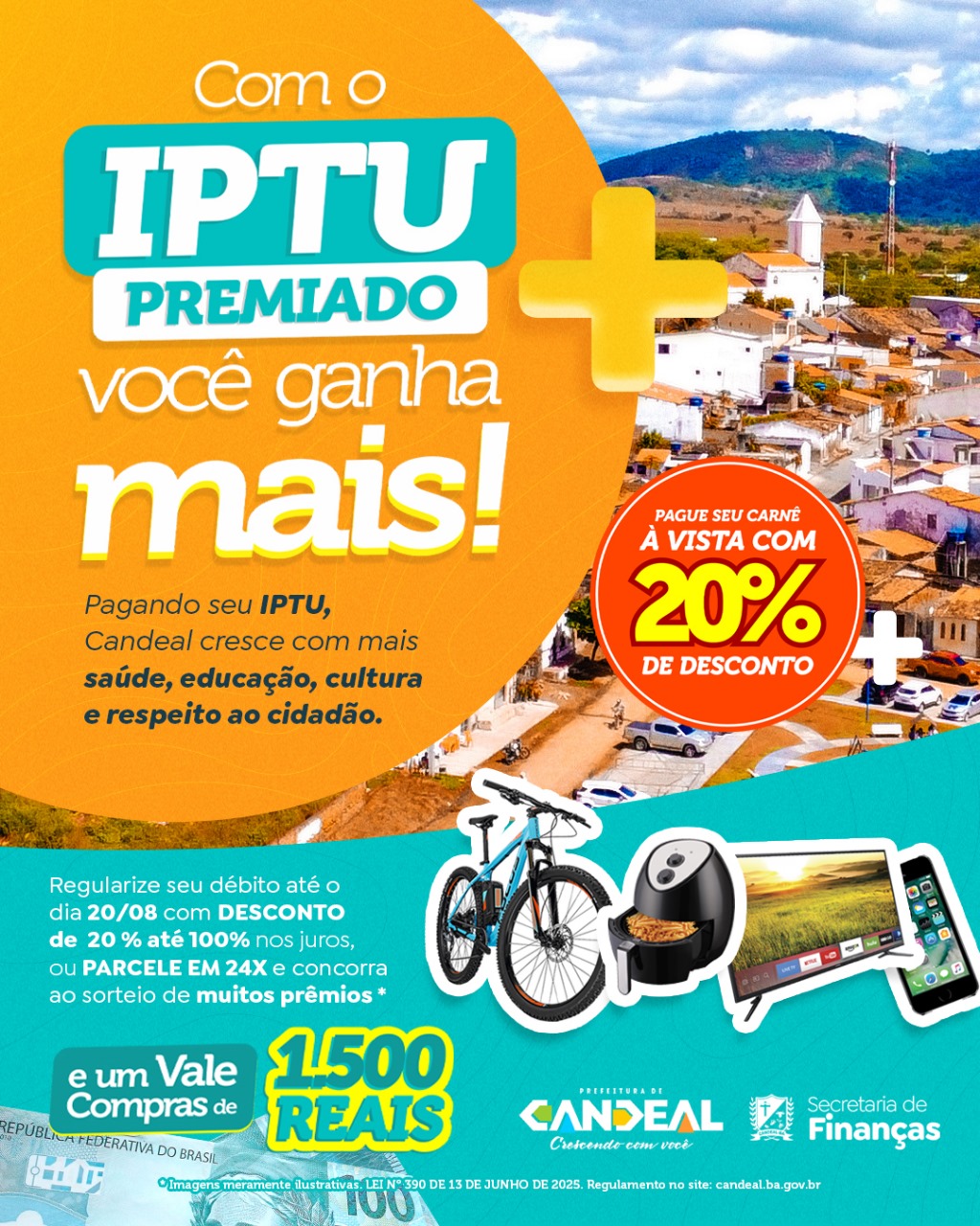 Por meio do Decreto Nº 285 de 08 de julho de 2025, a Prefeitura Municipal de Candeal regulamentou a Lei Municipal nº 390, de 13 de junho de 2025, que institui a Campanha Promocional “IPTU Premiado”.