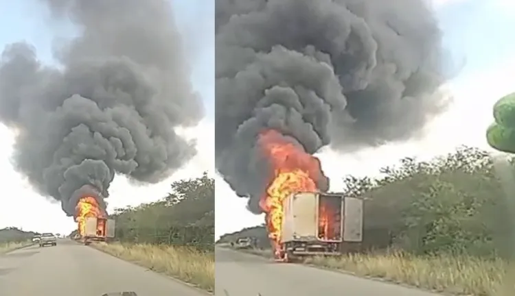 Coité: Caminhão baú é consumido pelo fogo às margens da BA 409